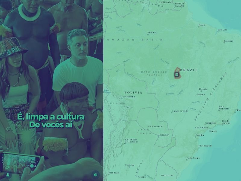 L’animateur de télévision Luciano Huck demandant aux populations autochtones du parc indigène du Xingu de « faire le ménage dans leur culture » pour une photo. Illustration réalisée par Global Voices sur Canva à partir d’une capture d’écran d’Instagram @txaigibran’s et d’une carte de l’ISA (Institut socio-environnemental). Utilisée avec permission.